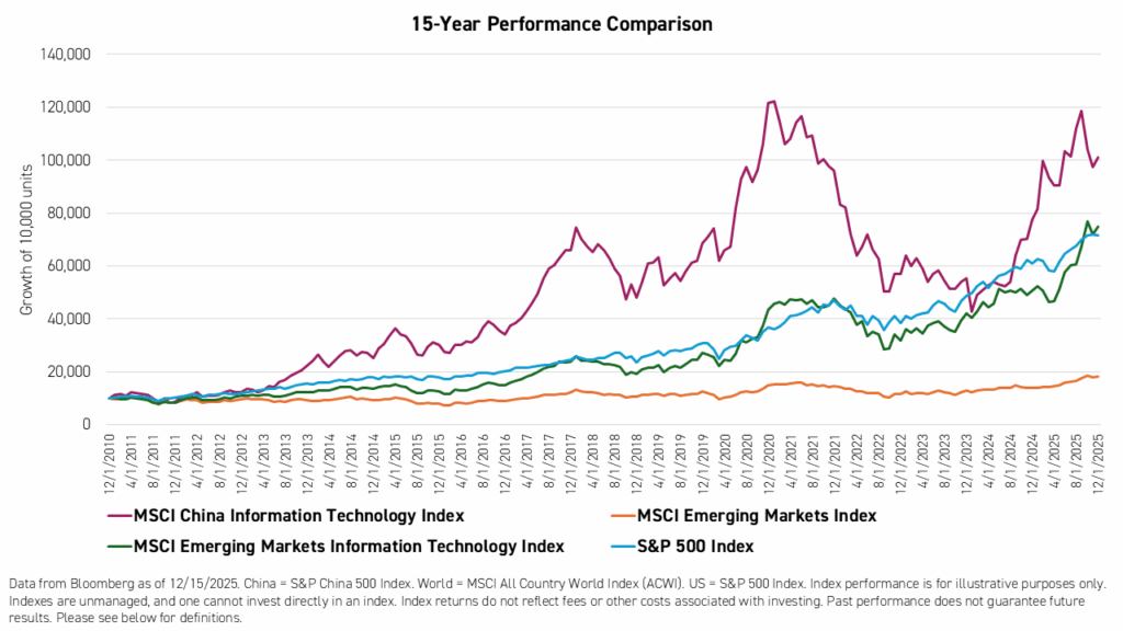 That being said, there is one segment of emerging markets that has outperformed through most of this period. China's technology sector, as measured by the MSCI China Information Technology Index, has outperformed broad-based US, global, EM, and EM technology indexes over the past 15 years, albeit with significantly more volatility.