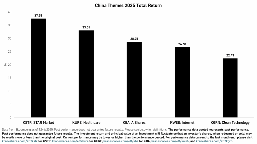 - To diversify into China’s AI, internet, and technology ecosystem, investors can use the KraneShares CSI China Internet ETF (Ticker: KWEB), which focuses on the largest internet firms, the KraneShares SSE STAR Market 50 Index ETF (Ticker: KSTR), which provides exposure to cutting-edge hardware and healthcare innovators, and/or the KraneShares Emerging Markets Consumer Technology ETF (Ticker: KEMQ), which provides comprehensive access to internet platforms and chipmakers in China and over 11 different emerging markets.