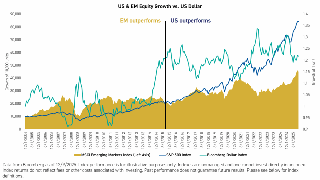The past decade saw U.S. equities significantly outperform their international counterparts, accompanied by a steady rise in the U.S. dollar against most major currencies. We believe the next decade may not resemble the last. Instead, it could echo the period preceding it, when emerging markets outperformed amid persistently higher U.S. interest rates and a weakening dollar.