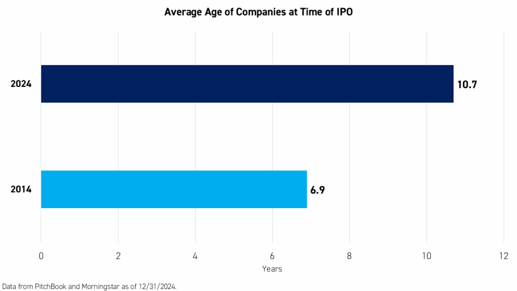 Companies are staying private for longer. This is a global phenomenon that is playing out in the United States, with examples including OpenAI, xAI, and Anthropic, and in China with companies like ByteDance and Ant Group. Higher interest rates, the increasing complexity of present investments in AI infrastructure, and a host of other factors are leading companies to put off listing publicly, increasing the average age of a firms at IPO.