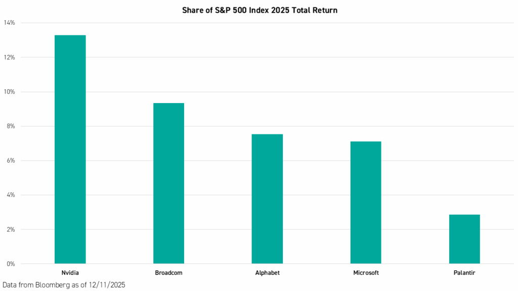More concerning, however, is how narrowly those gains have been generated. AI-led market performance has been concentrated in the so-called "Magnificent Seven" and a small group of core infrastructure beneficiaries. Nearly 40% of the S&P 500 Index’s total return in 2025 came from just five stocks: Nvidia, Broadcom, Alphabet, Microsoft, and Palantir.1 For investors, this creates an uncomfortable trade-off: remain exposed to one of the most powerful technological shifts in history, or risk overconcentration in a handful of names.