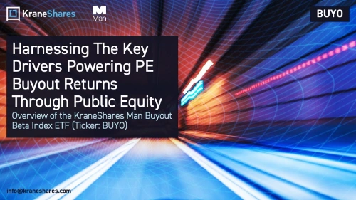 The KraneShares Man Buyout Beta Index ETF (Ticker: BUYO) seeks to track the performance of the Man Buyout Beta Index, which is designed to provide exposure to a subset of public equities that feature the key characteristics of companies held in PE/buyout funds. The Index employs a systematic approach to select a portfolio of small to mid-cap stocks, targeting industries favored by PE firms as well as companies that are similar in size and display similar company-specific characteristics as those in traditional PE funds.