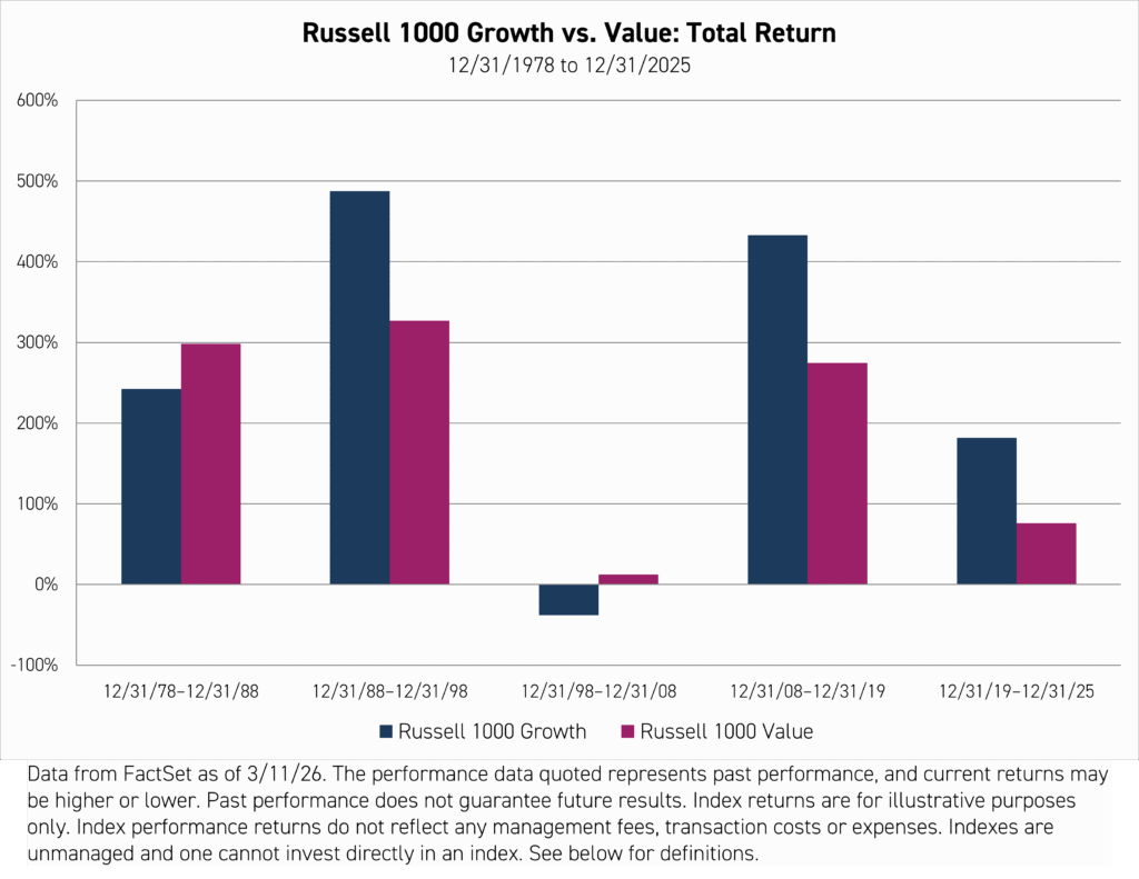 Early 2026 could be a simple correction or the start of a longer-term shift to value. Or maybe something else entirely. In any case, this could be a good juncture for thoughtful investors to reconsider their exposures. For years now, all that has been necessary to beat the market has been to tilt toward growth, particularly the largest growth stocks. That party could be over.