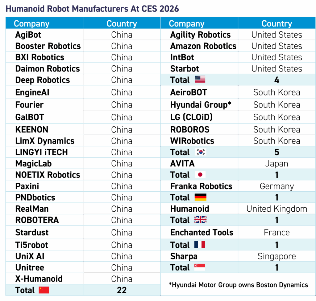 Walking the halls of CES, I encountered dozens of new humanoid robot brands—alongside component manufacturers, data-collection platforms, operating systems, and embodied-intelligence software providers. One thing quickly became obvious: the epicenter of this ecosystem is China. As seen in the chart below, many humanoid exhibitors either came directly from China or were founded by Chinese engineers now operating in Silicon Valley or elsewhere. Mandarin was spoken as frequently as English. I believe this may be a sign of an improving geopolitical atmosphere, as management teams were eyeing the US market and were enthusiastic about their future business prospects here.