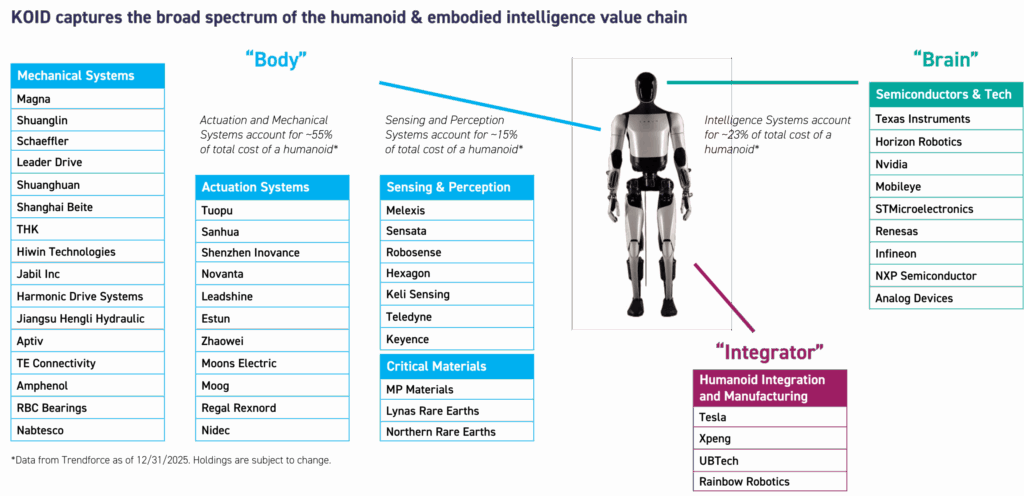 KOID provides differentiated exposure across the humanoid value chain—integrators bringing robots to market, intelligence platforms enabling interaction, data infrastructure training models, and component manufacturers shaping cost and reliability. CES reinforced that this framework reflects how the industry is already organizing itself.