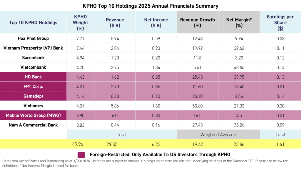 As investors are looking to opportunities outside the United States and especially within emerging markets, amid a declining US dollar, Vietnam looks compelling. As of February 11, 2026, the average P/E ratio among KPHO's underlying holdings was only 9.7 compared to 17.2 for the MSCI Emerging Markets Index. At the same time, Dragon Capital, the fund's sub-advisor, expects net profit growth of 16% to 18% in 2026, which is in line with the MSCI Emerging Markets Index.2